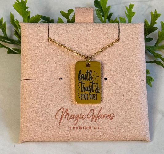 Faith Trust and Pixie Dust Engraved Stainless Steel Necklace, Silver or Gold Engraved Necklace, Personalized Jewelry, Peter Pan inspired