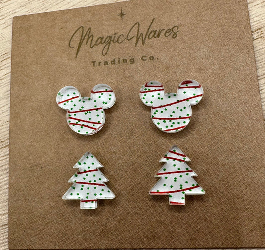 Snack Cake Combo Mouse and Tree shape, Laser Cut Snack Cake Pattern Crystal Acrylic Stainless Steel posts Pierced Earlobe Christmas earrings