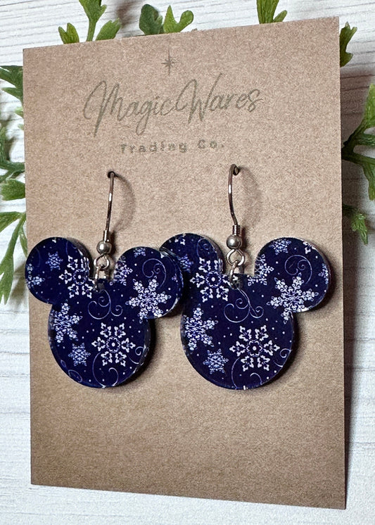 Pink Snowflakes Mousehead Acrylic Earrings, Snowflakes print on Crystal Acrylic, Christmas party earrings. Snowflake earrings