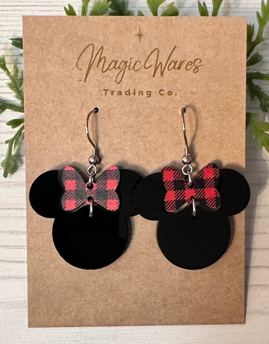 Red Plaid Minnie Bow Dangle Earrings, Laser cut Black Acrylic Earrings Buffalo plaid bow black earrings Christmas Earrings, Fall Earrings