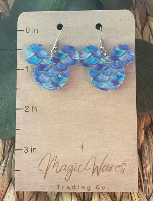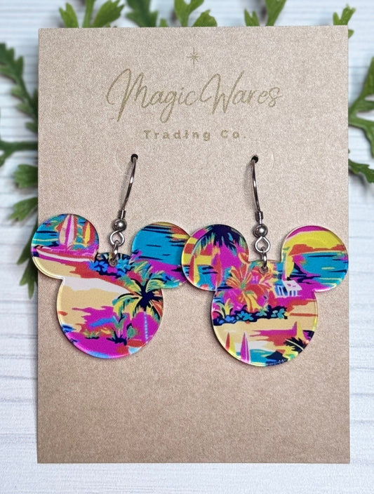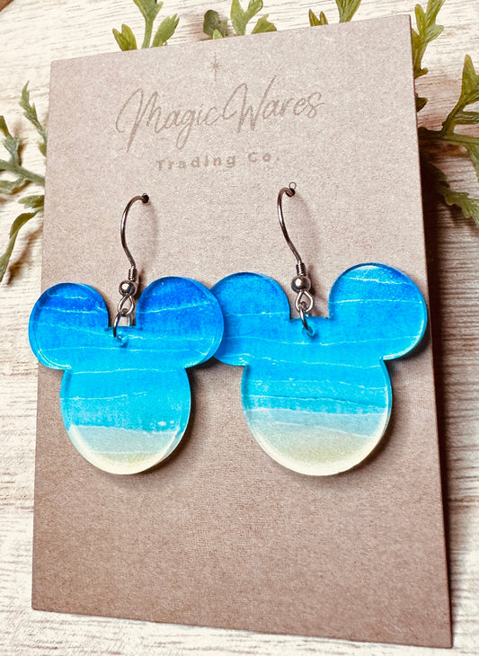 Watercolor Beach, Mouse head shaped, Laser cut Crystal Acrylic Earrings, Made to order, Summer Earrings