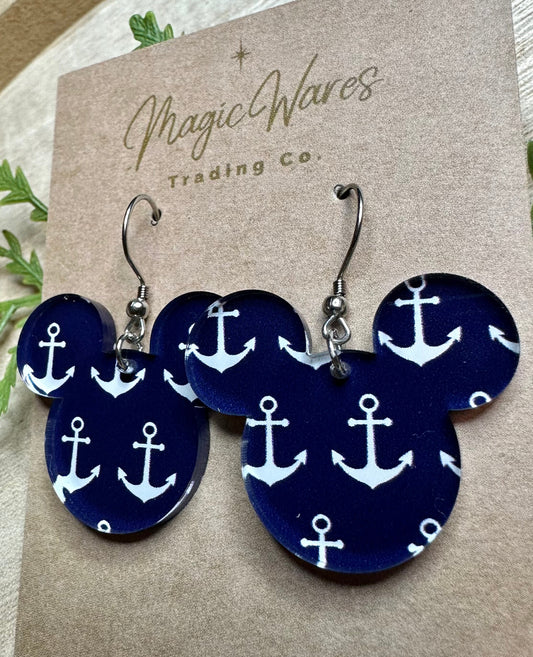 Let's Cruise, Mouse head shaped dangle earrings, Laser cut Navy with White Anchors Patterned Crystal Acrylic Earrings, Made to order