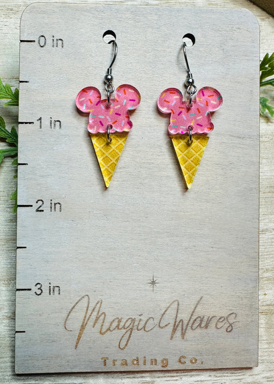 Main St Ice Cream, Mouse ears Ice Cream Cone Laser cut Patterned Crystal Acrylic Earrings, Made to order Glowforge Earrings