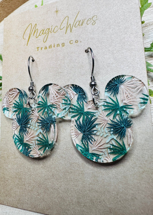 Tropical Palmetto, Polynesian style, Mouse head shaped Laser cut Acrylic Earrings, Dangle Earrings, Made to order, Lightweight earrings