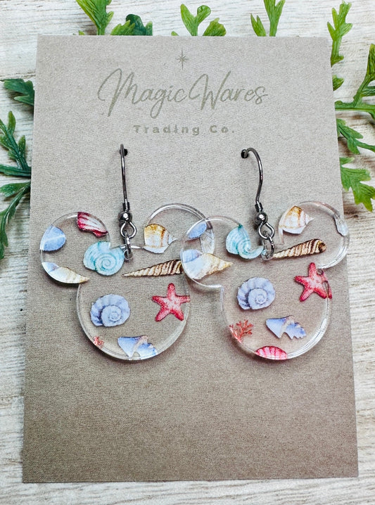 Seashell Mouse, Laser Cut Dangle Earrings , Seashells patterned Crystal Acrylic Earrings, Dangle Earrings, Beach inspired earrings