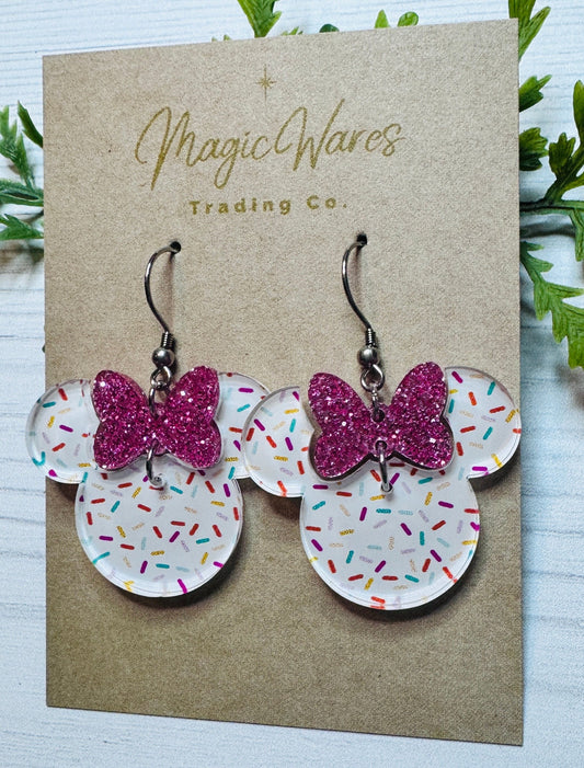 White Sprinkles Pink Glitter Minnie Bow Dangle Earrings, Laser Acrylic Earrings Sprinkles with White background