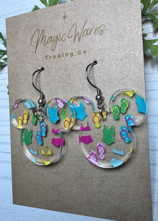 Pool Day Mouse head Laser Cut Earrings, Swimsuits and Flip Flops Patterned Acrylic Dangle Earrings, Lightweight acrylic Beach earrings
