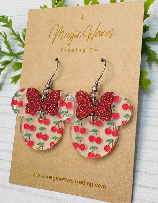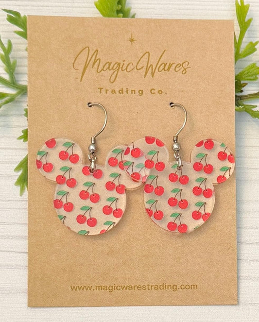 Cherries Mouse Dangle Earrings, Bright Cherry Printed Pattern Acrylic, Lightweight dangle earrings, Magical Earrings, Summer Earrings
