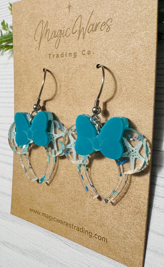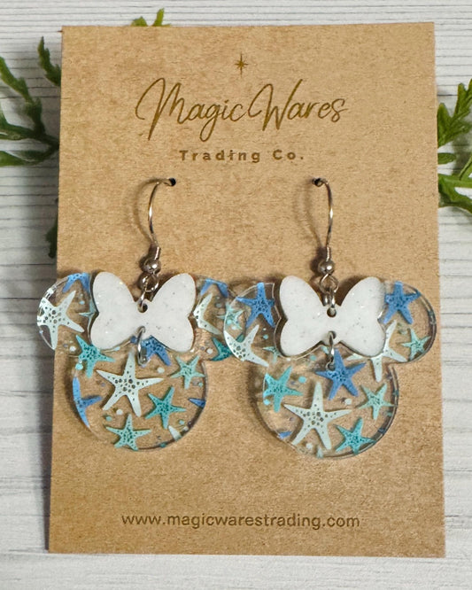 Starfish Minnie, White Glitter Minnie Bow Dangles, Laser cut Starfish Pattern Acrylic Earrings, Mermaid inspired earrings, Beach earrings
