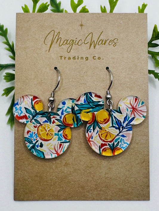 Watercolor Oranges Mouse head Laser Cut Patterned Crystal Acrylic Earrings, Dangle Earrings, Florida Earrings, Sunshine Seasons