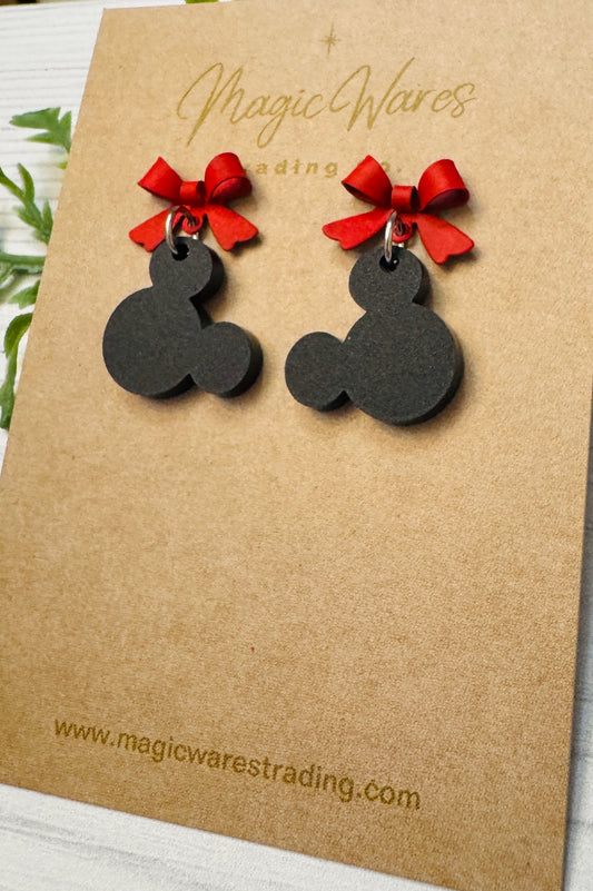 Red Bow Mouse Head Stud Earrings, Black Mouse Head Acrylic Gem, Valentines Day Earrings