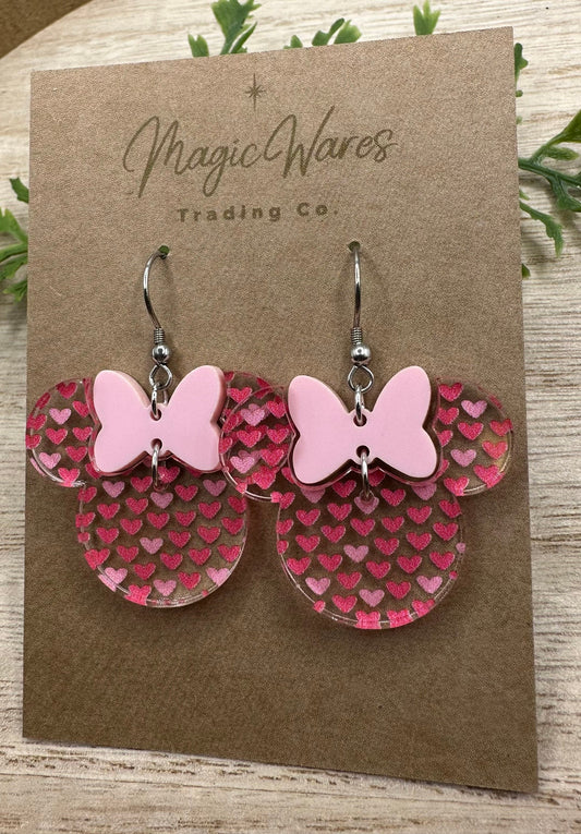 Sweetheart Minnie, Pink Acrylic Minnie Bow Dangle, Laser cut Hearts Pattern Acrylic Earrings, handmade earrings, Glowforge Earrings