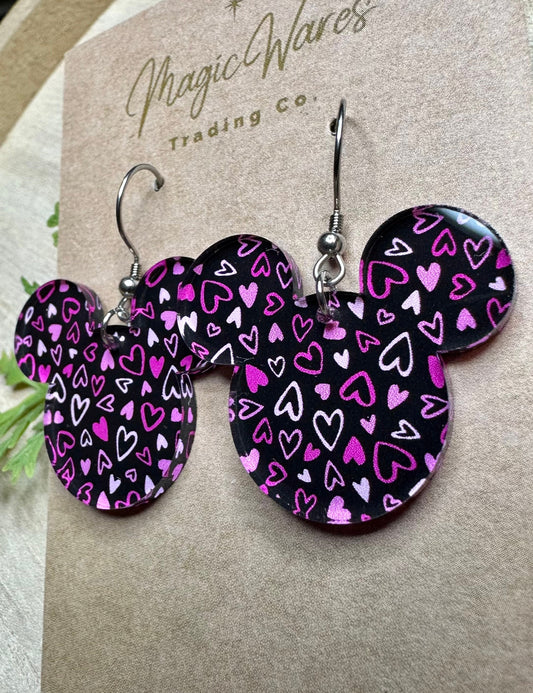 Black Hearts Valentine, Mouse head Laser cut Dangle Earrings, Black with Pink Hearts Patterned Crystal Acrylic, Valentines Earrings