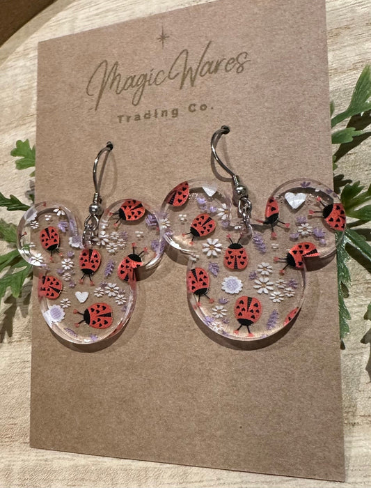 Love Bug, Mouse head Laser cut earrings, Hearts, Flowers and Lady Bug Patterned Crystal Acrylic Dangle Earrings, Valentines earrings