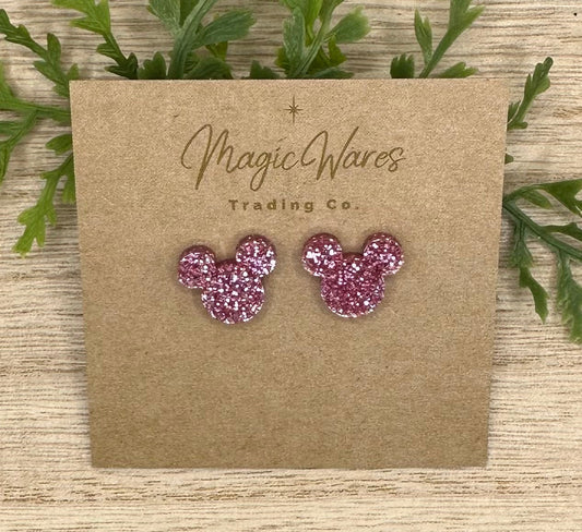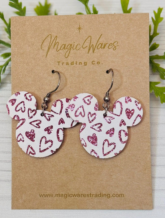 Pink Glitter and White Hearts Mouse head Laser cut Dangle Earrings, Pink Glitter Acrylic with white hearts, Valentines Day Earrings