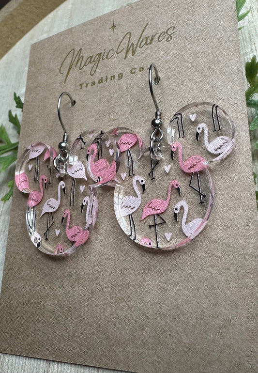 Love Birds, Mouse head shaped dangle earrings, Laser cut Flamingo and Hearts Patterned Crystal Acrylic Earrings, Made to order