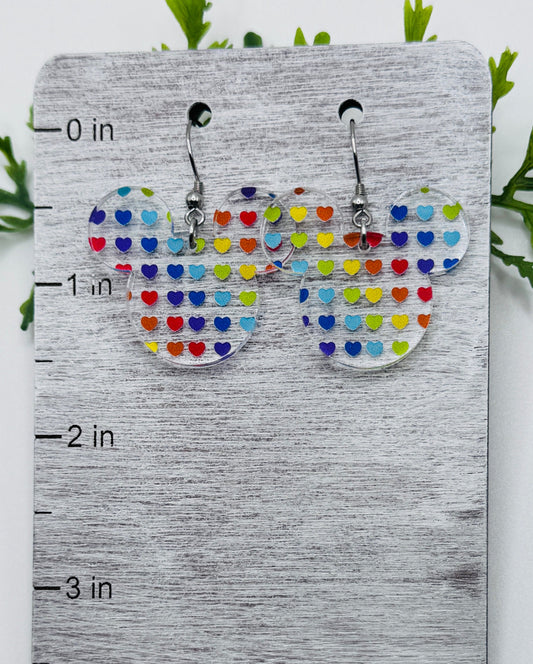 Rainbow Hearts Mouse head Laser Cut Patterned Crystal Acrylic Earrings, Pride Earrings, Vacation Earrings, Pride Month