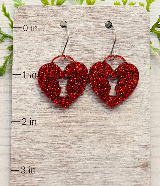 Hearts Lock Valentine Dangle Earrings, Laser cut Red Glitter Acrylic Dangle Earrings, Valentines Day Earrings, Gift for Valentines Day