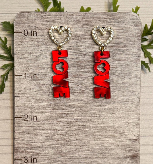 LOVE Rhinestone Heart Stud Earrings, Laser Cut Red Marble Acrylic and Sterling Silver Stud Earrings, Valentines Day Earrings