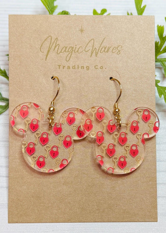 Key to my Heart Mouse head Dangle, Laser cut Heart and Key Patterned Crystal Acrylic Dangle Earrings, Valentines earrings