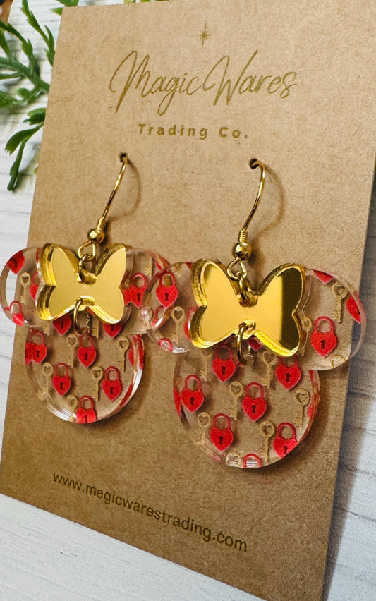 Key to my Heart Minnie, Gold Mirror Acrylic Minnie Bow Dangle Earrings, Heart Lock and Key Pattern Acrylic Earrings, Valentines Day Earrings