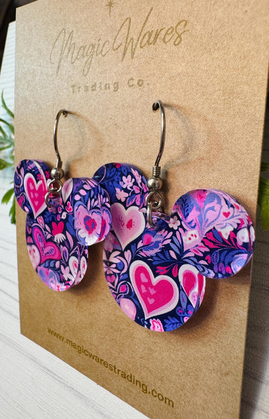 Purple Hearts Valentine Mouse head Laser cut Dangle Earrings, Purple and Pink Hearts Patterned Crystal Acrylic, Valentines Day Earrings