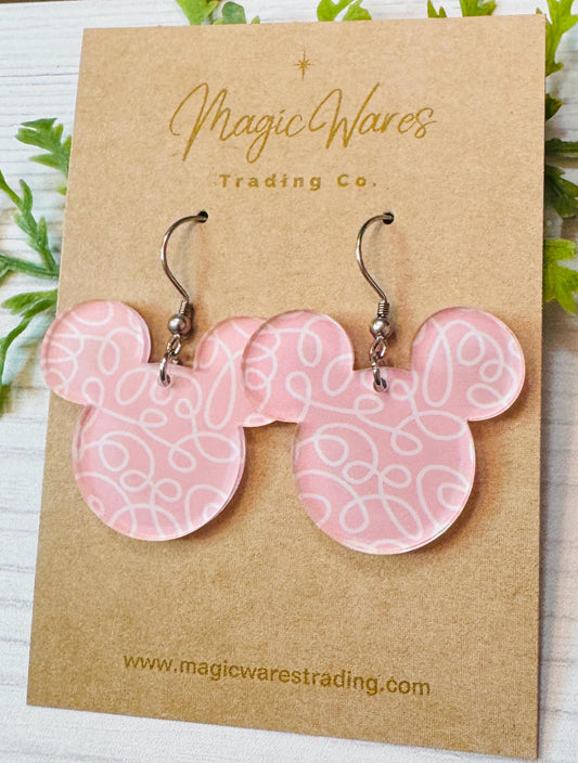 Valentine Snack Cake Mouse head Laser cut Dangle Earrings, Pink and White Patterned Crystal Acrylic, Valentines Day Earrings