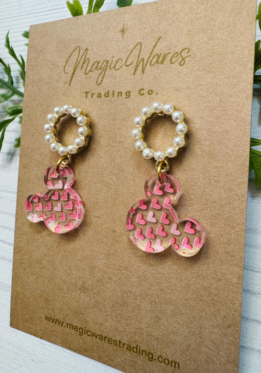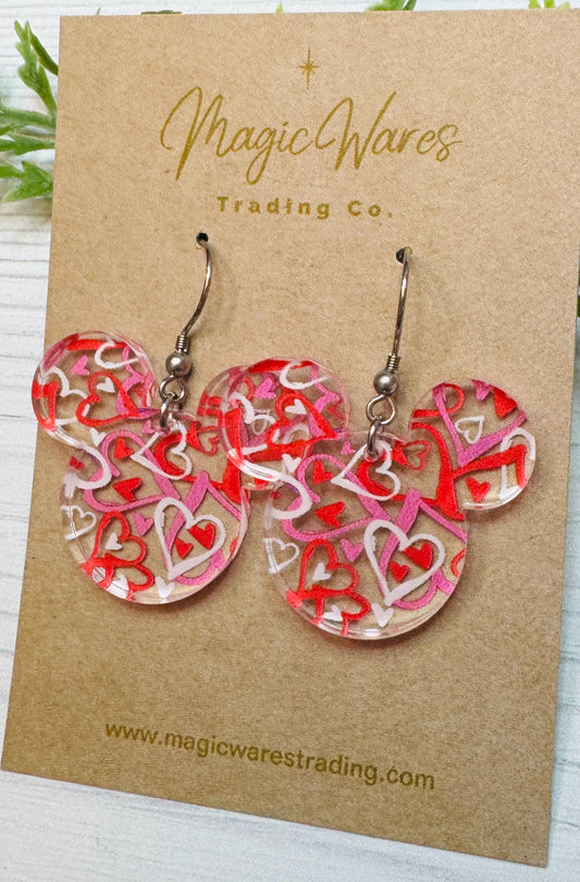 Scattered Hearts Mouse head Dangle Earrings, Laser cut Pink Red and White Hearts Pattern Crystal Acrylic Earrings, Valentines earrings
