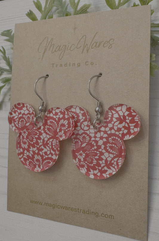 Red Lace Mouse Head Laser cut Dangle Earrings, Red Lace Patterned Crystal Acrylic, Valentines Day Earrings, Gift for Valentines Day