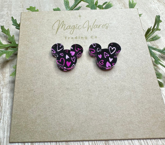 Black Hearts Stud, Mouse head shaped, Laser cut from Black Hearts pattern crystal acrylic, Pierced earlobe post back earrings