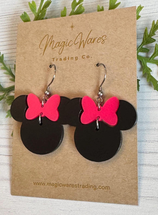 Hot Pink Minnie Bow Dangle Earrings, Laser Acrylic Earrings Hot Pink and Black Mouse head earrings, Valentines Earrings, Hot pink earrings